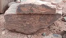 Among the many inscriptions at Jabal al-ʿHayn are a number in Arabic which date to the earliest years of the Islamic calendar. One inscription quotes Quran, Surah 18 Al-Kahf verse 21.[2] The inscription was studied by Fred Donner and published in 1984.[3] Following a frequently found formula, the inscription implores God to grant forgiveness and then bears witness to the hour of final judgement. In a second record of singular historical importance, an individual named Rāfiʿ bin 'Alī declares "I believe that there is no God except Him in whom the children of Israel believed, (believing as) a Muslim Hanif; nor am I among the polytheists."[4] This gives a direct quote of Quran, Surah 10 Yunus verse 90.[5]