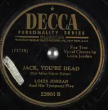 "Jack, You're Dead" is a song written by Dick Miles and Walter Bishop. It was performed by Louis Jordan and his Tympany Five, recorded in October 1946, and released on the Decca label (catalog no. 23901-B).[1] The song describes a man's physical state if he fails to respond to romance.[2]