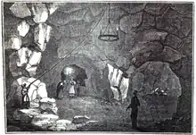 Entered by a flight of forty steps,[6] it consisted of three or more separate caverns joined to one another by tunnels. The first or main cavern is roughly circular and about 35 ft (11 m) in diameter. Leading from this is another about 60 by 30 ft (18.3 by 9.1 m).[6] There is a long, winding passage leading to a chamber which is about 24 by 31 ft (7.3 by 9.4 m), varying in height from 6 ft (1.8 m) to 11 ft 6 in (3.51 m), with a well of pure water, 27 ft (8.2 m) in depth,[3] although in 1939 this was found to be 21 ft (6.4 m), partly brick lined and quite dry.[7] At its lowest it is 170 ft (52 m) from the surface.[6]