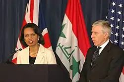 In August 2006, it was claimed by William Rees-Mogg in The Times that there was evidence that Straw was removed from this post upon the request of the Bush administration, possibly owing to his expressed opposition to bombing Iran.[39] This would be ironic, as Richard Ingrams in The Independent wondered whether Straw's predecessor as Foreign Secretary, Robin Cook, was also removed at Bush's request,[40] allowing Straw to become Foreign Secretary in the first place. It has also been alleged that another factor in Straw's dismissal was the large number of Muslims amongst his Blackburn constituents, supposedly considered a cause for concern by the US.[41] Some Iranian dissidents mocked Straw as "Ayatollah Straw" after his frequent visits to Tehran in the aftermath of the 11 September attacks.[42]