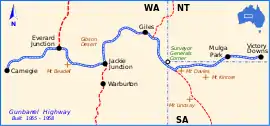 In May 1958 during survey work to determine the course of the Gunbarrel Highway, Beadell travelled through virgin scrub from Giles to Warburton, an existing Aboriginal mission station.[2] He selected the location approximately 65 kilometres (40 mi) north of Warburton as the commencement point for the next section of the Gunbarrel Highway. Survey westward from Jackie Junction took place from 14–28 May 1958, a road from Jackie Junction to Warburton was built in late August 1958, and construction of the final section of Gunbarrel Highway began on 3 September 1958 towards Carnegie Station. The road was completed on 15 November 1958.[3]