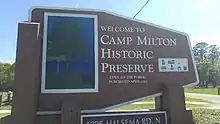 The trail comes close to its midpoint to the Civil War Camp Milton Historic Preserve. With three miles (5 km) of fortifications constructed of earth and timber in February & March 1864, Camp Milton was "first line of defense against the Union forces in Jacksonville in 1864, with over 8,000 troops.[8][9] Named after Florida's Governor during the Civil War, John Milton, the camp was the site of several encounters (not battles) between Confederate and Union armies before the camp was occupied by the Union army in the summer of 1864. Work on the preserve is relatively recent. After the 1973 discovery of the site, the property was purchased by the State of Florida in 1981. The City of Jacksonville, with the assistance of Preservation Project Jacksonville, purchased the initial tract from the state in April 2001 and later expanded it with additional purchases. In September 2006, the completed preserve, including an educational center, replicas and a preserved Florida cracker farmstead, was opened for public use.[8][9]
