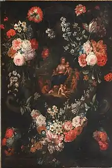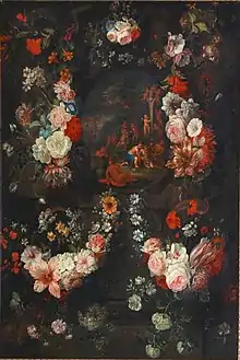 Garland paintings were usually collaborations between a still life painter who painted the garland and a figure painter who filled the central cartouche with an image. The cartouche in the center of Caproens's garland paintings is filled with religious as well as mythological imagery. A pair of garland paintings entitled Cartouche still life of flowers around an image of Caritas and Cartouche still life of flowers around a bacchanal of putti (Town hall of Braunlage) have respectively a religious and secular cartouche. [5]