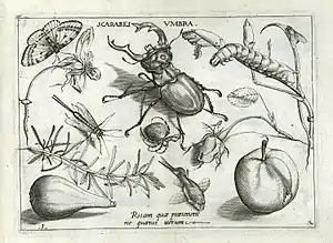 His first important work was the Archetypa studiaque patris Georgii Hoefnagelii, which he published in 1592 in Frankfurt. The book is a collection of 48 engravings of plants, insects and small animals shown ad vivum. It is divided in four parts of twelve plates (each with separate frontispiece), made after designs by his father Joris Hoefnagel and engraved by Jacob who was only 19 years old at the time of publication.[11] The Italian scholar Filippo Buonanni asserted in 1691 that these engravings are the first published instance of the use of the microscope. However, this assertion of Buonanni is still contested.[12] As the quality of the engravings varies, it is assumed that some of the works were made by members of the family De Bry who resided in Frankfurt.[3] The prints in the collections were intended not solely as representations of the real world. They also carried a religious meaning as they encouraged the contemplation of god's plan of creation. Like contemporary emblem books each print carried a motto typically referring to god's interference in the world. The prints of the book were used as models by other artists and the Hoefnagel motifs were copied until the 19th century. It has been argued that the prints stood at the basis of the typical Dutch genre of still lifes with flowers, shells and insects.[13]