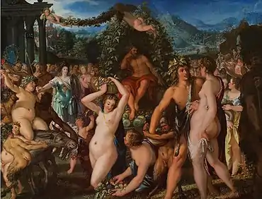 Unlike his father who preferred drawing, Jacob was an accomplished oil painter who produced works in the Prague Mannerist style popularised by artists such as Hans von Aachen and Bartholomeus Spranger.[14] As a painter Hoefnagel specialized in small format mythological or allegorical scenes on vellum or copper.[6] During his stay at the court in Prague he produced many paintings of which only a few have survived.[3] The Morgan Library & Museum holds an Orpheus charming the animals dated 1613 in a late Mannerist style and a Winter dated 1618.[15] Only a few portraits of Hoefnagel are known, all executed during his stay in Sweden. These portraits include a bust portrait of king Gustaf Adolf (The Royal Armoury) and the queen consort Queen Maria Eleonore of Sweden dated around 1624. He received 150 national dollars and a gold chain from the king for this commission. The original of the oil painting of the queen consort is lost and is now known through the engraving made by Hendrik Hondius I in 1629.[10]
