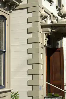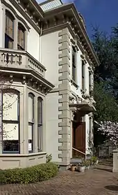The house, completed in 1871, was designed for Jacob Kamm by architect Justus F. Krumbein, who was also involved in the design of the Oregon State Capitol.[3][4] The construction was overseen by L. Therkelsen,[5] and cost $80,000.[6] While the French Second Empire style building suggests a stone or stucco exterior, it is actually built with flush horizontal siding and wooden quoins.[7][8][9] The wooden shingles on the Mansard roof are scalloped to appear like slate.[8] The building is approximately 8,671 square feet (805.6 m2) in three stories plus a basement, and contains six bathrooms.[10] It was sited on Kamm's Goose Hollow 14th and Main 11 acres (4.5 ha) property.[11] The original address to the house was 488 Main Street; the city's streets were renamed in the early 1930s and the location became Southwest 14th and Main.[12][13][14]