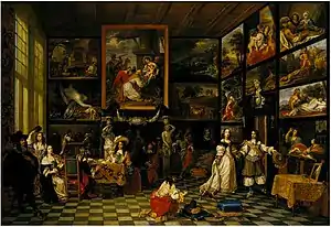 Two compositions belonging to the genre of the 'gallery paintings' are attributed to him: the Interior of an art gallery (private collection) and the Cabinet of pictures, currently in the Royal Collection.[5] The 'gallery paintings' genre is native to Antwerp where Frans Francken the Younger and Jan Brueghel the Elder were the first artists to create paintings of art and curiosity collections in the 1620s.[6] Gallery paintings depict large rooms in which many paintings and other precious items are displayed in elegant surroundings. The earliest works in this genre depicted art objects together with other items such as scientific instruments or peculiar natural specimens. The genre became immediately quite popular and was followed by other artists such as Jan Brueghel the Younger, Cornelis de Baellieur, Hans Jordaens, David Teniers the Younger, Gillis van Tilborch and Hieronymus Janssens.[7]