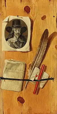 Some of his works clearly have a vanitas meaning. The genre of vanitas still lifes offers a reflection on the meaninglessness of earthly life and the transient nature of earthly goods and endeavors. This meaning is conveyed in these still lifes through the use of stock symbols, which reference the transience of things and, in particular, the futility of earthly wealth: a skull, soap bubbles, candles, empty glasses, wilting flowers, insects, smoke, watches, mirrors, books, hourglasses and musical instruments, various expensive or exclusive objects such as jewellery and rare shells. In the Trompe-l'œil still life with a skull the vanitas meaning is expressed by the presence of the skull and the words memento mori (Latin 'remember that you [have to] die') below it.[5] The portrait of King Charles I of England, who fell from power and was executed, in the Trompe-l'œil painting with an engraved portrait of King Charles I is an often used symbol in vanitas paintings to express the precariousness of worldly status and position.[1]