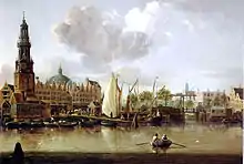 View of the Haringpakkerstoren (since demolished) and behind that the round dome of the Lutheran church on the Singel.