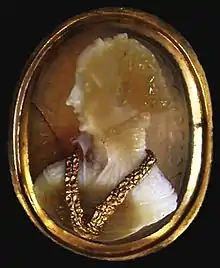 A small number of identifiable surviving works other than prints include signed intaglios in the Bibliothèque nationale de France in Paris (the Annunciation to the Shepherds in rock crystal) and the Metropolitan Museum of Art in New York (Queen Bona),[21] and an unsigned attributed piece in the Ambrosiana in Milan (Bona in crystal),[22] medals in Padua and elsewhere, and cameos in Munich (illustrated) and elsewhere.[23] He also produced relief plaquettes in bronze.