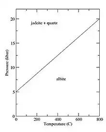 Jadeite occurs with albite in metamorphic rock of the low-temperature, high-pressure blueschist facies at destructive plate margins.[9] Although it is intermediate in silica content between albite and nepheline, it is not stable under the conditions in which these two minerals are present. Formation of jadeite requires a pressure of 10 to 25 kbar and a temperature of 600 to 1,000 °C (1,100 to 1,800 °F) via the reaction:[9]