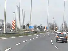 Jadranska Avenue was conceived as an expressway approach for the Zagreb–Karlovac highway (today part of A1), the first highway in Croatia.[1] Together with the Karlovac expressway, its construction cost 110 million Yugoslav dinars.[10] It was built in 1972 as an extension of Dubrovnik Avenue (then called Boris Kidrič Avenue after the eponymous Yugoslav political figure) and it spanned from the Dubrovnik Avenue and Adriatic Bridge intersection to the old Lučko Interchange, without any exits. The avenue was 28 meters (92 ft) wide and had three traffic lanes in each direction, similar to the A1 lane setup, which also features a 28-meter pavement with three lanes in each direction, but one of them is marked as a hard shoulder.[1][10] At the time, the Zagreb bypass was in planning stages and the Lučko Interchange only provided access to Lučko and the old Karlovac Road through two RIROs (still used today) and the large stack interchange was built and opened for traffic as late as 1979.[1] Like most Croatian highways, the expressway was planned with a design speed of 120 kilometers per hour (75 mph) in mind.[10]