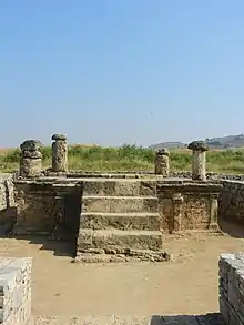 The Jain devotional reliefs called Ayagapatas, particularly that dedicated by Vasu, shows a probable design of the Jain stupa.[6] The stupa drum is set on a high platform, and accessed by a flight of stairs and an ornate torana gate, quite similar in style to the toranas of Sanchi.[6] Niches with images can be seen in front of the platform.[6] The drum of the stupa is elongated and cylindrical, and formed of three superposed tiers separated by railings and decorated bands.[6] The stupa starts to round off only above these three tiers.[6] The platform may have been squared, with Persepolitan-type columns in each corner, similar to those seen in the Vasu Ayagapata.[6] On the Vasu ayagapata, one of the Persepolitan pillars is surmounted by a Dharmachakra wheel, and the other pillar was probably surmounted by an animal, as seen in other similar ayagapatas.[6]
