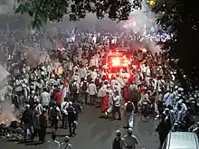 The protests began around noon with a march from Istiqlal Mosque to the presidential palace. The march was mostly non-violent and organised.[4] Estimates for the attendance ranged from 50,000[3] to 200,000.[4] Former Parliament Speaker Amien Rais, Vice-Speakers of Parliament Fahri Hamzah and Fadli Zon, an Islamist leader Bachtiar Nasir, leader of FPI Muhammad Rizieq Shihab, as well as celebrities Ahmad Dhani and Rhoma Irama attended the protest.[20][21] However, after nightfall, past the allotted time for the protest,[22] groups of violent demonstrators provoked a riot and clashed with the police, setting fire to some vehicles. One elderly man died in the riots,[23] and at least 160 protesters and 79 police officers were injured.[4] The location of the protest began to calm down around 21:00 local time.[24]