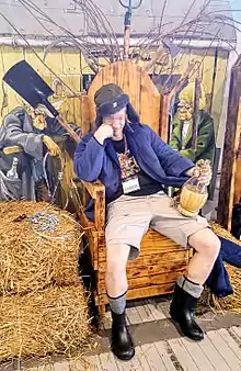 Wędrowycz has spawned a collectible card game and a fandom convention, Dni Jakuba Wędrowycza (Days of Jakub Wędrowycz).[1] The card game was released in 2011.[8] The convention has been held in Wojsławice, a village featured in many stories related to Wędrowycz, since 2006.[9] In 2013, during the eighth annual convention, a 3 m (9.8 ft) tall wooden monument of Jakub Wędrowycz was unveiled.[10][11][12] In 2019, plans for raising a similar statue of another character from the series, Jakub's friend Semen Korczaszko, were announced.[13] In 2016, a regional branch of PTTK, a Polish tourist organization, created a badge for those who visit local tourist attractions related to the Wędrowycz stories.[14]