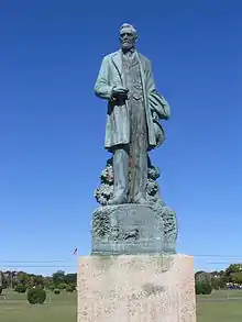 A statue of Bradley stands in front of the Paramount Theater and Convention Hall complex in Bradley Park.