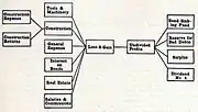 In Modern corporation accounting, (1908) Lyons picture some of the transactions and entries which are peculiar to corporations and corporation accounting. In doing so, he presents one of the earliest modern flow diagrams of cost accounting. These relation was originally pictured by Emile Garcke and J. M. Fells in their System of factory accounting from 1889. Lyons had simplified these relations into one single flow diagram:
