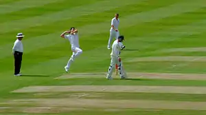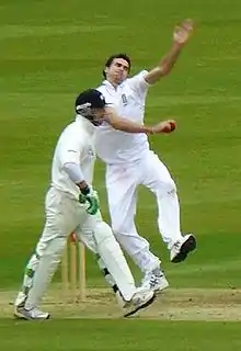 2005 was Anderson's first full season for Lancashire. He was propelled into the England side soon after his Lancashire debut and had returned to rediscover his form after winter tours with England where he had spent the majority of his time on the sidelines, and when given a chance for England he often bowled poorly due to a lack of match practice.[23] He finished the season with 60 first-class wickets at an average of 30.21 and 27 one day wickets at an average of 22.00.[19][24]