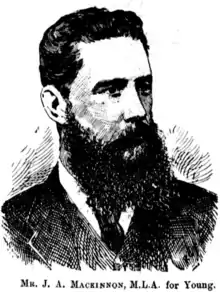 He was born in Benalla and was educated at Scotch College, Melbourne. He worked as a station agent around the Murray River, and eventually owned land around Young.[1] In 1882 he was elected to the New South Wales Legislative Assembly as the member for Young.[2] In 1885 he was defeated by two votes, in a result that was overturned and resulted in Mackinnon resuming his seat.[3] Initially associated with the Protectionists, he joined the Labor Party when it formed in 1891, but refused to sign the pledge and was defeated as a Protectionist in 1894.[2] He later moved to Grenfell, where he died in 1910.[1][4]