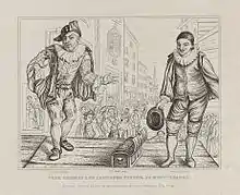 An oil caricature of Sterne by Thomas Bridges, painted as a double portrait with a caricature of Bridges by Sterne, was owned by Atkinson. It is known that Sterne in his part of the composite work followed closely an engraving The Infallible Mountebank, or Quack Doctor, an old broadside satirising Hans Buling, after Marcellus Laroon.[6][7] In 1761, before travelling to France, Sterne left behind details of the "lady" who was then owner of the oil portrait, with Elizabeth Montagu.[8]
