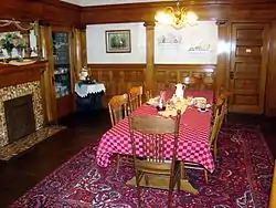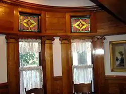 Lumberman Simmons' utilized oak extensively throughout the house. Features include a built-in oak china cabinet, carved oak newel posts, dentil molding, extensive oak panels, oak pocket doors, and oak flooring.
