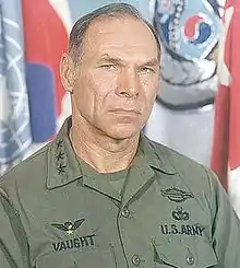Vaught was a two-time recipient of the Silver Star award in Vietnam.[2] Other US awards include three Legions of Merit, the Distinguished Flying Cross, the Soldiers Medal, two Bronze Star Medals, the Meritorious Service Medal, six Air Medals, the Joint Service Commendation Medal, two Army Commendation Medals, and the Purple Heart Medal.[3]