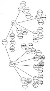 At the end of the first chapter a chart is presented of a business organization (see image), which has similarities with both an organizational chart and mind map. The charts building blocks mention both business function (executive), departments (Mfg. Dept.; Selling Dept.; Accounting Dept.; etc.), records (Purchase Records; Sales Ledger; etc.), business activities (Time Keeping; Cost Accounting; etc.), and cost accounting classes (Labour Direct; Labour Indirect; etc.). In a similar way organization departments had been pictured by Griffith, such as the Purchasing Department, Stock Department and Advertising Department (see below).