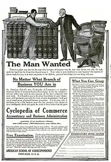 Griffith also wrote the section on "Purchasing and stores" co-authored with W. J. Graham, and the section on "Credits."[28] A significant part of the co-authors and collaborators also participated in the 1910 "Cyclopedia of Commerce, Accountancy, Business Administration." Furthermore also a significant part of the content, and almost all illustrations were used in that 1910 business encyclopedia.