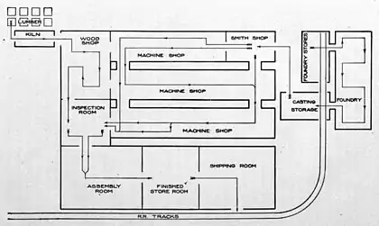 Another feature Griffith demonstrated in his work Systematizing and later works is the charting of factory layout and routing. In Systematizing he gave one example in the third section about "The Stock Department," where as example he illustrated two arrangements, or routing diagrams, for handling lumber: