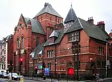 They were characterised by their broad naves with narrow aisles; transepts which projected hardly, if at all, beyond the aisle walls, and brick vaulted chancels with north and south aisles. The exteriors were plain and unbuttressed, in red brick with stone sparingly used for window dressings and plate tracery, and for occasional bands of relief.[10] Another East London church, St Andrew, Plaistow, was similar in conception, but faced in stone.[6] Brooks tended to use stilted arches, and employed a distinctive type of lierne vault in his chancel, in which the vaults themselves were brick and the ribs stone.[10] Brooks also designed the furniture and liturgical furnishings of several of these churches, most notably at St Columba's;[11] at St Chad's, he designed the reredos, carved by Thomas Earp, and the pulpit.