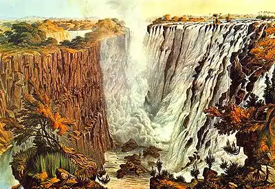 By 1854 he had teamed up with Samuel H. Edwards, another explorer, and launched an expedition to Lake Ngami after which he trekked through the territory between Northern Bechuanaland and the Zambesi. An easygoing man, he was able to get on with the Bushman hunters of the semi-desert interior and spent long periods in their company, obtaining valuable help from them. Returning to Ngami, he travelled north to the Okavango River, crossing Damaraland and reaching Walvis Bay. Here he busied himself with cattle-trading in Damaraland, before setting out on an expedition with his brother Henry and Thomas Baines and lasting from December 1860 to September 1864. Their aim was to explore the Zambesi from the Victoria Falls down to its delta, with a view to testing its navigability. However, these plans were bedevilled by sickness and misfortune. They did reach the Zambesi, but did not get to explore the mouth. On 23 July 1862 they reached the Victoria Falls. It was on this expedition that Baines painted many of his famous scenes which were reproduced in an album of prints. His attempt at exploring the Zambesi ruined his health and exhausted his finances. He returned to Cape Town in 1864, dispirited and fever-stricken. The expedition was notable since it was the first time that a stereoscopic camera had been used to record its progress. The size of the negatives was about 6 x 4.5 inches and of rather poor quality. Prints of these photographs are at the Africana Museum in Johannesburg.