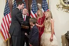 In 2016, Comer entered the Republican primary election for the 1st congressional district of Kentucky against two other competitors. Before the primary, he was endorsed by the National Rifle Association and the US Chamber of Commerce.[31] He won the primary with 60.6% of the vote.[28] Comer was elected to the House with 72.6% of the vote.[16] Since Whitfield had resigned in September, Comer actually ran in two elections on November 8–a special election for the last two months of Whitfield's 11th term, and a regular election for a full two-year term. Comer won both elections over Democratic nominee Samuel L. Gaskins with over 72% of the vote.[32] He was sworn in soon after the results were certified, giving him two months' more seniority over the rest of the 2017 freshman class.