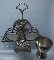 Their registered trade mark since 1879 was a Trumpet with a Banner hanging from it. Although registered in 1879, the "Trumpet with Banner" logo was used at times before registration and appears on some of their silver plate pieces. They were one of the foremost names in EPNS and sterling silver tableware including silver tea services and hollowware pieces. They also made silverware serving pieces and had a wide catalogue of patterns. Their tea sets and hollowware pieces produced in silver are very valuable as antiques.