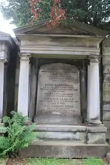 His body was returned to Edinburgh for burial in Dean Cemetery. The large, simple tomb lies on the western wall in the section known as "Lords Row". His wife and children lie with him.