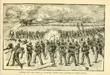 The Third Brigade fell back for over a month engaging in skirmishes around Hatcher's Run, Halifax road, and Rowanty Creek as part of the Richmond Campaign.[44][45] Major operations resumed on March 31, 1865, when Gwyn led the Third Brigade in the Battle of White Oak Road, and eventually on to Five Forks, Dinwiddie County, Virginia.[46] The Third Brigade took part in the Battle of Five Forks on April 1, 1865.[4][19]