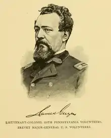 James Gwyn (November 24, 1828 – July 17, 1906) was an officer in the Union Army during the American Civil War. He immigrated at a young age from Ireland in 1846, initially working as a storekeeper in Philadelphia and later as a clerk in New York City. At the onset of the war, in 1861, he enlisted and was commissioned as a captain with the 23rd Pennsylvania Volunteer Infantry. He assumed command of the 118th Pennsylvania Regiment in the course of the war. Gwyn led that regiment through many of its 39 recorded battles, including engagements at Seven Pines, Fredericksburg, Shepherdstown, Five Forks, Gettysburg, and Appomattox Court House.