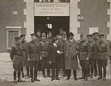 When the United States entered World War I in April 1917, Harbord was hand picked by General Pershing to be his chief of staff in France, which won him a promotion to brigadier general. Together with Pershing and thirty other generals, they set sail for England on 28 May 1917.[8][9] Harbord worked closely with Pershing, now the commander of the American Expeditionary Forces (AEF) on the Western Front, on the buildup of the American Expeditionary Force (A.E.F.) in France, including the shipping schedules of American forces being sent to Europe. Following a great German offensive against the Western Front on March 21, 1918, the English and French armies were in retreat, and the need for American troops was urgent. Previously agreed to arrangements to provide 120,000 servicemen a month for three months was cast aside when General Pershing was informed by the English that by using confiscated Dutch shipping, over 300,000 soldiers could be sent a month.[10][11][12][13][14] However, due to manpower attrition within the British Expeditionary Force (B.E.F.), its combat divisions were reduced in strength by 25%, and with the breakthrough on the front, the English were asking that only infantry and machine gun battalions be sent over, and all other units be held back. The American policy on this matter was quite different: General Pershing was sent to France to organize American Armies under American leadership; the idea that its combat units would be used solely as replacement units, or as reinforcements, for foreign countries was unthinkable. President Wilson would not agree to this. He thought the idea would not go over well with the American public, and it risked preventing an American army from ever being formed. In secret conversations, General Pershing even said he was willing to risk the fall of France, because the United States would still carry on the war against the Kaiser; if his forces were stripped away from him and the allies lost, then Germany would win complete victory. For his part, Prime Minister Clemenceau thought this plan appealed to the romantic side of America's intervention.[15]
