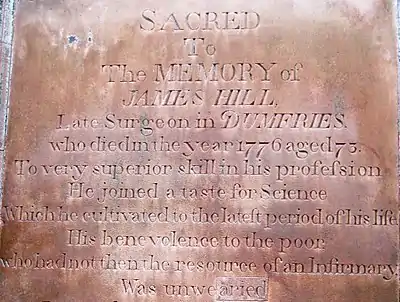 In 1732 Hill returned to Dumfries where he set up in surgical practice. On 28 January 1733 he married Anne McCartney,[8] whose father John owned the Blacket (or Blaiket) estate, in the Parish of Urr and it was there that they established the family home. His practice was conducted from his town house in Amisfield's Lodging in the Fleshmarket, in Dumfries.[9] There is no known portrait of James Hill but Murray provides this description: "... his height being about five feet eleven inches. He continued till his death to prefer that fashion of dress that had prevailed in his youth. He wore a full wig ; and used a large staff. He was a man of dignity both of appearance and manners."[6] Between 1742 and 1775, Hill trained sixteen surgical apprentices.[3] Of these one, Benjamin Bell (1749-1806) was to achieve international fame largely through the success of his best selling textbook A System of Surgery first published in 1783.[10]