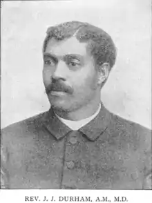 James J. Durham was born to James W. Durham and Dorcas Durham on April 13, 1849 near Woodruff, South Carolina in Spartanburg County. He and his mother were slaves of his father. At about the age of ten, they moved to a farm near Cashville, South Carolina where he worked until he was aged fifteen. At that point he was apprenticed to the blacksmith's trade which lasted until 1870. In July, 1867 he converted to the Baptist denomination and joined the Pilgrim Baptist Church in Greenville County and later that year was licensed to preach. In June 1868 he was ordained and made pastor of Foster Chapel in Spartanburg County fifteen miles from his home. He held the pastorate for eighteen months when he resigned and attended a school in Greenville Court House, continuing to work on Saturday's and during the summers. During the summer of 1873 he took courses in Latin and Algebra and entered the senior preparatory class for South Carolina College, failing to gain entrance to the Freshman class of the school. He took a job teaching the next summer and in October 1874 he entered the freshman class with a scholarship[1] and some financial support from his father.[2] When the State government became democratic, funding to the school was dropped, and in the spring of 1877, South Carolina College closed. In October 1877 he entered the Junior class of Atlanta University in Atlanta, Georgia. In May 1879 he left Atlanta University and in March 1880 he enrolled at Fisk University where he graduated with an A. B. in May.[1]