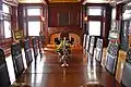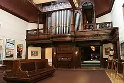 The interior features an art gallery that housed Hill's collection of painting and sculpture. It even had a pipe organ, installed after someone suggested to Hill that other wealthy people had pipe organs in their homes. The house had a hybrid system of gas and electric lighting, with rotary switches on the walls to turn on the electric lights. However, there were no electrical outlets installed, because during that era electricity was only used for lighting. The woodwork in the house is very intricate, with hand-carved woodworking in the central hallway, the formal dining room, and the music room. Other rooms in the house, particularly on the second floor where most of the family members lived, do not have hand carved woodwork, but the woodwork is still richly colored and nicely detailed.