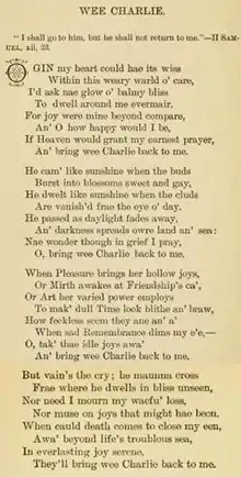 Their first child, Charles, was born in December, 1876. Isabella was born on February 22, in 1879. Just two and a half weeks later, Charles died. His father’s grief was expressed in a most moving poem, "Wee Charlie," below.