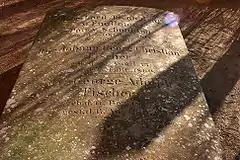 Findlater died in 1811 and he bequeathed the Dresden property to Fischer who lived at Helfenberg Manor until his own death in 1860.[11] The Scottish heirs protested in court on the ground that the bequests to Fischer had been made for an immoral consideration (i.e. "ob turpem causa").[12] Also upon his death, the earldom of Findlater became dormant. The title of Earl of Seafield passed to his cousin Sir Lewis Alexander Grant (1767–1840) who also took the surname Ogilvy. Findlater is buried at the Loschwitz parish church. The gravestone includes both Findlater and his partner Johann Georg Christian Fischer (1773–1860).