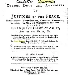 Parker printed an enlarged version of the Conductor Generals in 1749 which was a work of outlining government officials duties and powers of justices of the peace, sheriffs, and coroners and was popular for many years among these government employees.[5] It was originally published in Philadelphia by Andrew Bradford in 1722 and reprinted five times after Parker's death, being popular until the end of the century.[16]