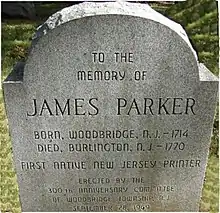 Parker acted as Franklin's agent in the Philadelphia business of Franklin & Hall when Franklin went to Europe.[6] His New York printing business was handed down to his nephew Samuel Parker in February 1759. Holt was the manager of the Connecticut Gazette and he ultimately took over the business in 1760.[18] Towards the end of Parker's life, many of his business partners took advantage of his poor health and directed his fortune to themselves, and he became known as the "weeping philosopher" for not understanding this.[32] Parker suffered many years from gout, and died at a friend's house in Burlington, New Jersey, July 2, 1770.[33] Although he was Episcopalian, he was buried near his parents in the First Presbyterian churchyard in Woodbridge.[25]