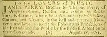 JAMES PERRY, Brother to Thomas Perry, of Anglesea-Street, Dublin, now resides in Back-lane, Kilkenny, where he makes and repairs Violins, Guitars and Tenors, in the best and [...] Manner, and hopes to [...] the Favour and Protection of his Friends and the Public by the strictest Attention to their Commands.