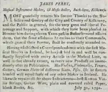 James Perry (Irish: Séamus de Poire; born c. 1759) was an Irish luthier from Dublin, known for making violins, violas and cellos.[1][2] His workshop was based in Kilkenny and also produced instruments such as guitars, German flutes, fifes and tenors. Perry is credited with having made over 1000 instruments.[3] He was a brother and apprentice of Dublin luthier, Thomas Perry, and a protégé of the Ormonde family of Kilkenny Castle.[4]
