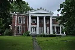 James Russell Webster House is a historic home located at Waterloo in Seneca County, New York. It is a temple front Greek Revival style residence. When built in 1850-1855 it featured a two-story, three bay, side hall main block flanked by two symmetrical one story, three bay center hall wings. In the 1870s, a veneer of Italianate details were added during and expansion and modernization. The expansion included adding a second story to each side wing. The front facade features a pedimented portico supported by four Doric order columns.[2]