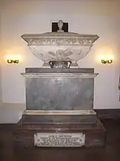 Smithson was buried in Sampierdarena, Italy. The United States consul in Genoa was asked to maintain the grave site, with sponsorship for its maintenance coming from the Smithsonian Institution. Smithsonian Secretary Samuel P. Langley visited the site, contributing further money to maintain it and requested a plaque be designed for the grave site. Three plaques were created by William Ordway Partridge. One was placed at the grave site, a second at a Protestant chapel in Genoa, and the last was gifted to Pembroke College, Oxford. Only one of the plaques exists today. The plaque at the grave site was stolen and then replaced with a marble version. During World War II, the Protestant chapel was destroyed and the plaque was looted. A copy was eventually placed at the site in 1963.[27] The cemetery in was going to be moved in 1905 for the expansion of an adjacent quarry. In response, Alexander Graham Bell, then a regent of the Smithsonian, proposed that Smithson's remains be moved to the Smithsonian Institution Building; in 1903, he and his wife, Mabel Gardiner Hubbard, traveled to Genoa to exhume the body. A steamship departed Genoa on 7 January 1904 with the remains and arrived in Hoboken, New Jersey on 20 January, where they were transferred to the USS Dolphin (PG-24) for the trip to Washington. On 25 January a ceremony was held in Washington, D.C. and the body was escorted by the United States Cavalry to the Castle.[34] When handing over the remains to the Smithsonian, Bell stated: "And now... my mission is ended and I deliver into your hands ... the remains of this great benefactor of the United States.” The coffin then lay in state in the Board of Regents' room, where objects from Smithson's personal collection were on display.