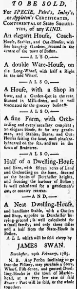 Swan emigrated from Fife, Scotland to Massachusetts in 1765. He worked at Thaxter & Son in Boston, as an apprentice where he became friends with Benjamin Thompson, later knighted Count Rumford to the King of Bavaria, and Henry Knox, a lifelong friend later a general in the Continental Army. He was a member of the Sons of Liberty, participated in the Boston Tea Party,[3][4] and served in the Battle of Bunker Hill in 1775. Friends and associates included Perez Morton, John Adams, Samuel Adams, Paul Revere, John Hancock, Joseph Warren, James Otis, Jr., George Washington, James Monroe, Paul Dudley Sargent, Gilbert du Motier, Marquis de Lafayette, Henry Jackson, James Sullivan, Charles Bulfinch, and Thomas Jefferson, The Library of Congress has several items by James Swan including those in Thomas Jefferson's collection.