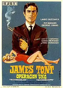 James Tont operazione U.N.O. or Operation Goldsinger is a French/Italian international co-production spy film spoof based on James Bond's Goldfinger.[1] Co-written and co-directed by Bruno Corbucci and Giovanni Grimaldi, the film stars Lando Buzzanca as James Tont Agent 007 1⁄2 a parody of James Bond and Loris Gizzi as Erik Goldsinger, a parody of Auric Goldfinger. It was followed by James Tont operazione D.U.E..
